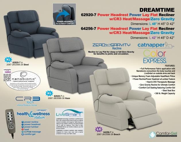 350 lb. Weight Capacity Comfort Coil Seating featuring Comfor-Gel Heat & CR3 Therapeutic Massage Nanobionic Performance Fabric Power Recline/Power Headrest w/Lumbar Steel Seat Box Unique Memory Foam Adjustable Head/Neck Pillow Zero Gravity Recline for Ultimate Comfort