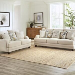 Casual Transitional Farmhouse-Inspired Design Comfort Coil featuring Comfor-Gel Floral Print, Awning Stripe and “Emoji” Decorative Pillows Intricate Piquet Weave Polyester Fabric Steel Tech Framing