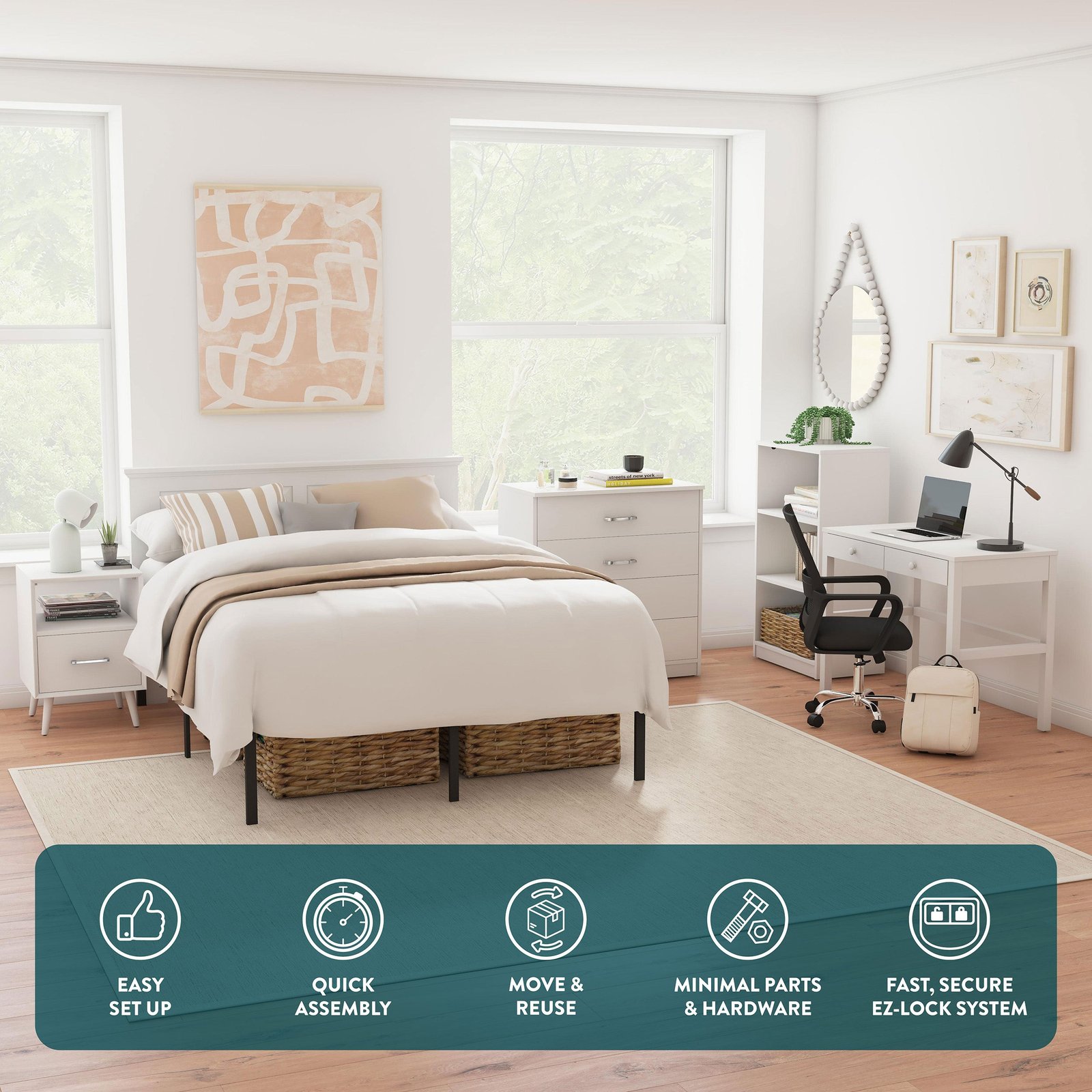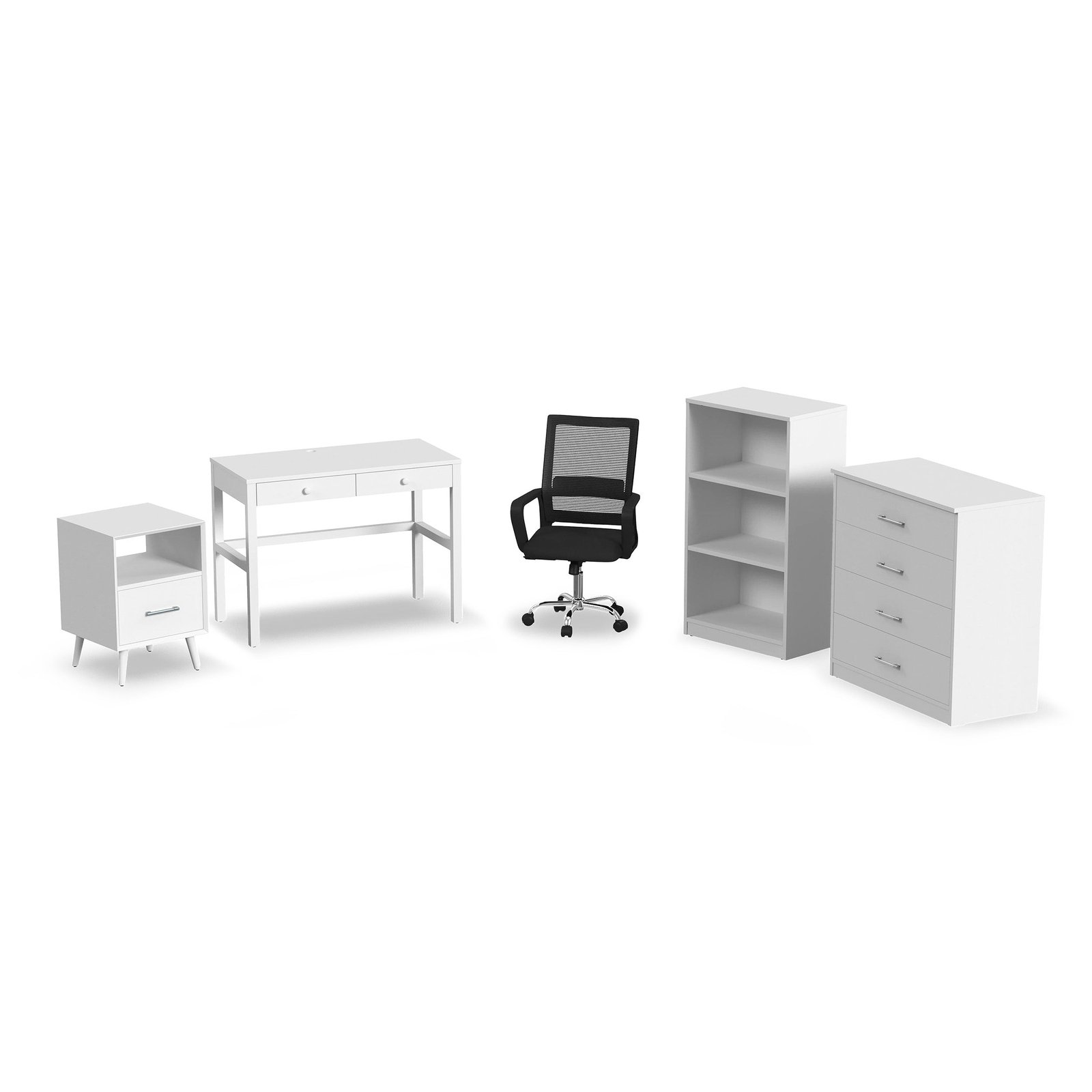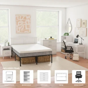 Simplify your space with the UBundle Bedroom Set, a sturdy, modern solution for college students, first-time renters, and anyone furnishing a new place. This 5-piece collection includes a nightstand, bookshelf, dresser, desk, and desk chair, everything you need to create a functional and stylish room.